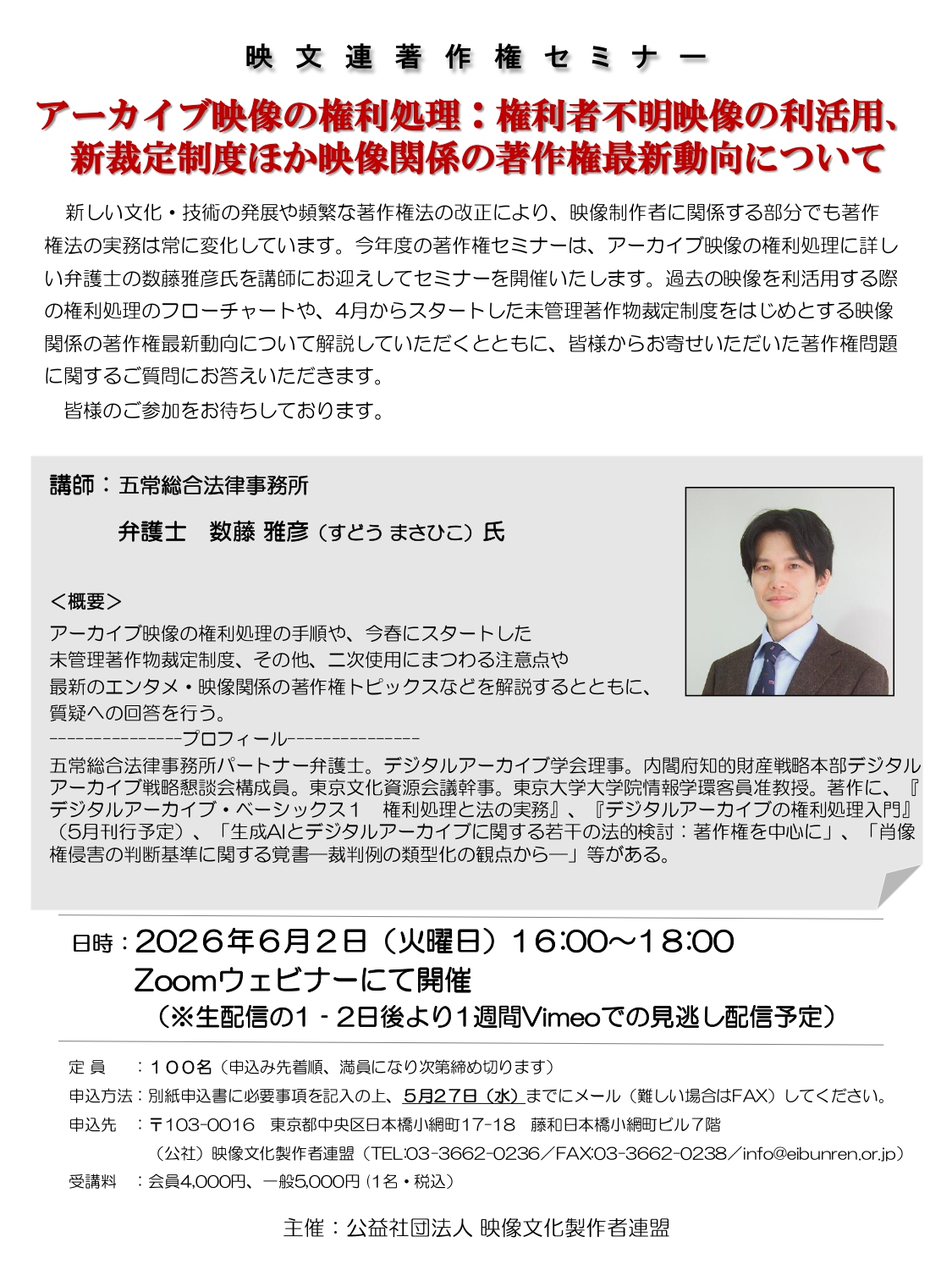 - 2026年度 映文連 著作権セミナー(Zoomウェビナー)参加申込書(Word)に必要事項をご記入の上、